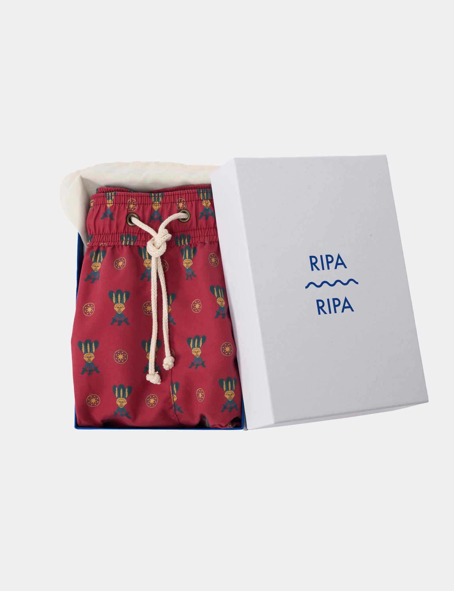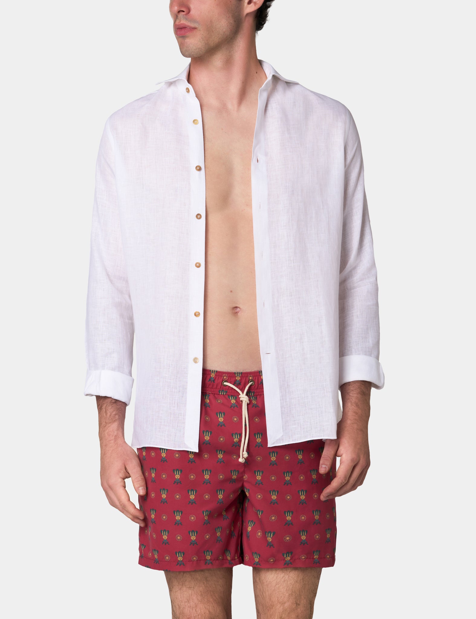 The classic swim shorts were redesigned for a more elegant, tailored look and a comfortable fit. Pattern drawn by hand. Made in Italy.